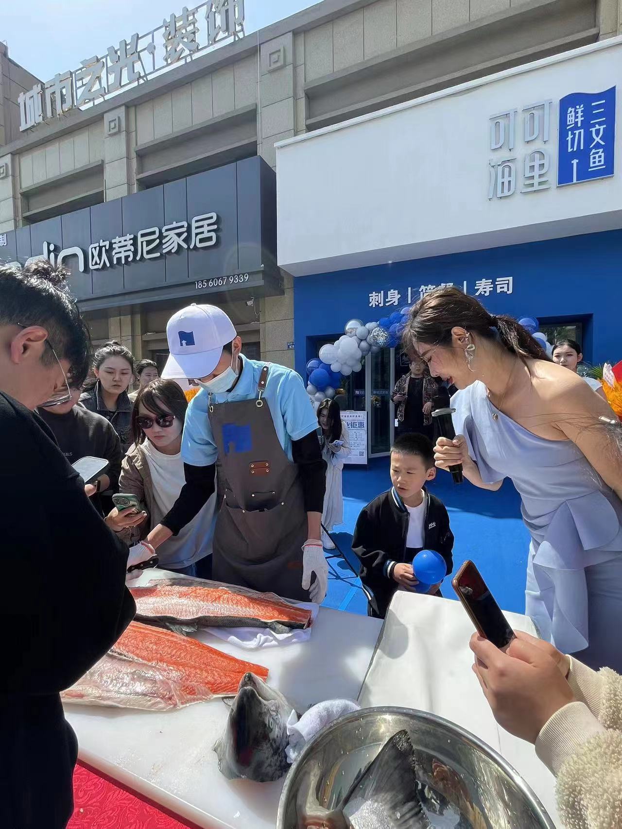 即墨店開(kāi)店首日,廚師現(xiàn)場(chǎng)切割冰鮮三文魚(yú)