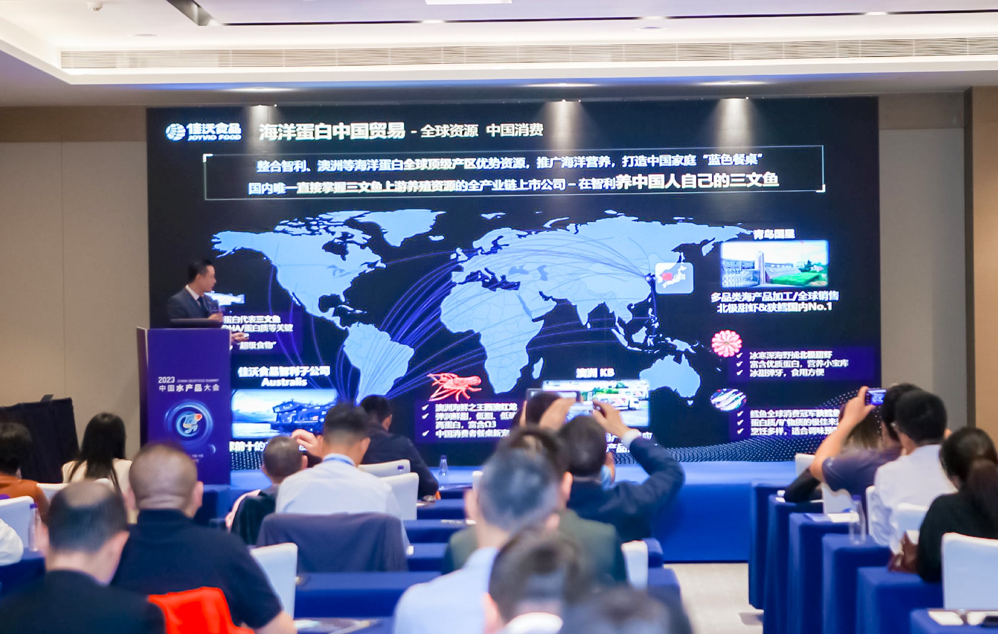 在“大宗水產(chǎn)品國際貿(mào)易與國內(nèi)外市場”的專題研討中,公司大宗銷售運營總監(jiān)梁欽垚發(fā)表演講,分享三文魚全球市場趨勢,介紹佳沃食品在全球海洋蛋白產(chǎn)業(yè)的布局及公司為推動中國水產(chǎn)行業(yè)大發(fā)展做出的努力和貢獻。