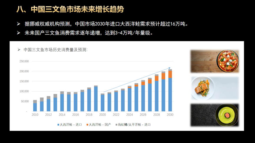 演講中,梁欽垚與與會行業(yè)伙伴分享了來自國際權(quán)威行業(yè)研究前沿的專業(yè)數(shù)據(jù)。他提到,疫情后時代,中國市場家庭烹飪場景中的三文魚消費占比增長明顯;三文魚作為一種高營養(yǎng)健康食材,正逐漸深入普通家庭的日常消費。隨著中國三文魚價格的理性回歸,未來三文魚消費需求將逐年遞增,無論國產(chǎn)三文魚還是進口三文魚,都將迎來新的發(fā)展機遇。